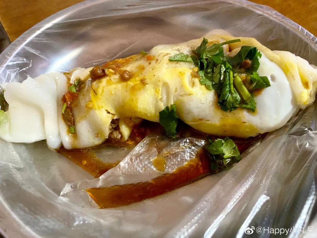上面淋得酱料很特别,还可以根据自己的口味来添加黄皮酱、番茄汁、葱油生抽、辣椒、花生碎等。粉皮爽滑,吃起来 Q 弹筋道,搭配不同的馅料和酱汁,味道非常独特。