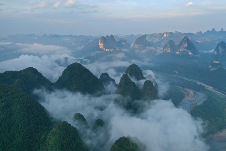 3月,春分时节,南风带来潮湿的水汽,白雾升腾,飘浮于峰林之间,形成一年中最独特的景观——“烟雨桂林”。 “简直美如仙境!”游客感慨,这是桂林风景最像水墨画的季节:隐约可见的山形是大自然着墨最深的落笔,山腰间的白雾是留白,凤尾竹摇曳的身姿十分吸睛……