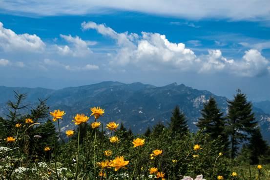 驼梁横跨两省四县(山西省的五台县,河北的阜平县、灵寿县、平山县),因其主峰似一“静卧巨驼”而得名。驼梁的最高峰海拔2281米,峰顶为亚高山草甸,这里林草覆盖率达90%以上,原始生态保存完好,植物近百科700余种,花卉200余种,药材100余种,野生动物180余种,素有“太行山绿宝石”“高山公园”“云顶花海”“天然氧吧”“天然动植物园”等众多美称。