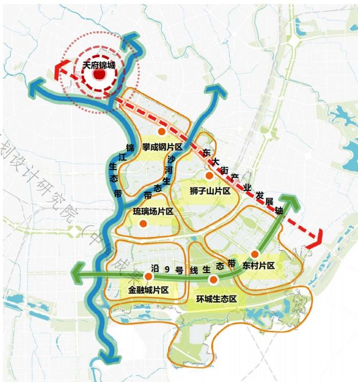 “ 三带 ” :三个生态带。锦江生态带突出文化休闲功能,沙河生态带突出亲水宜居功能,9号线生态带,突出生态休憩功能。严格控制生态带周边形态,塑造良好的滨水、临公园的城市空间界面。