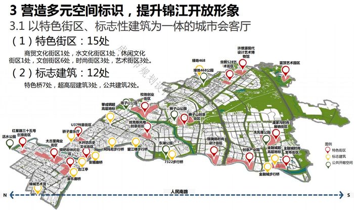 打造15座特色街区和12座标志性建筑,其中商贸文化街区1处,水文化街区1处,休闲文化街区1处,文创街区6处,时尚街区3处,艺术街区3处,特色桥7处,超高层建筑3处,公共建筑2处。