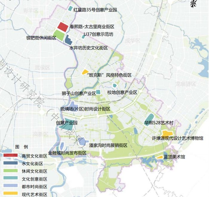 强化天府锦城、锦江带等重点区域的城市公共文化功能。规划新增重大文化设施18处,包括博物馆、美术馆、图书馆、剧院等。精心打造U37、镋钯街等15个都市快慢生活、优雅时尚、和谐相容的特色街区。其中商贸文化街区1处,水文化街区1处,休闲文化街区1处,文创街区6处,时尚街区3处,艺术街区3处。