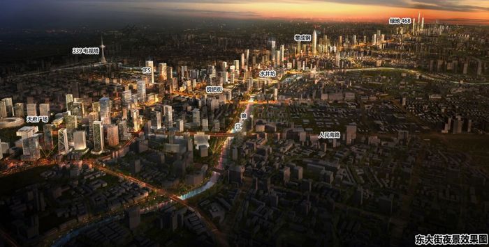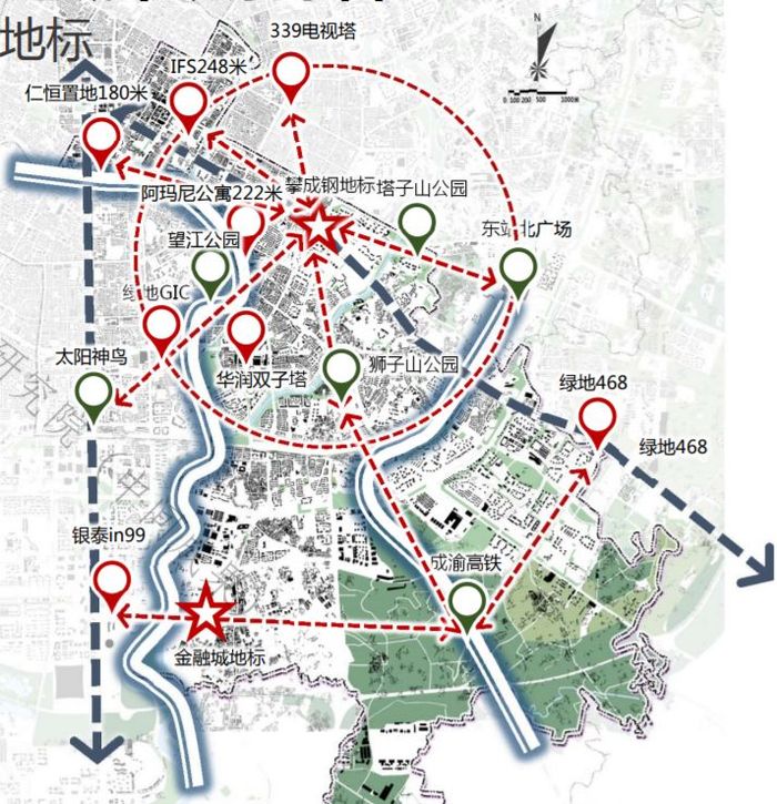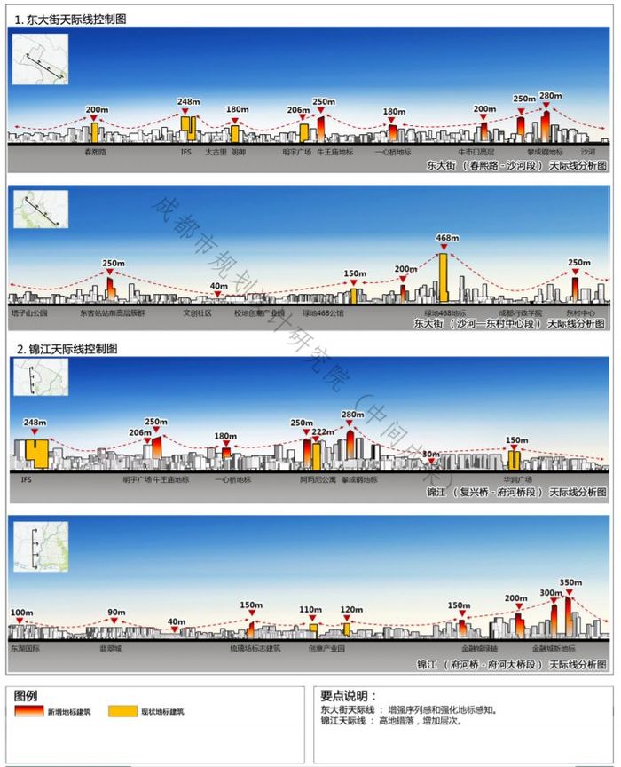 将对东大街和锦江两侧的天际线进行控制,其中东大街天际线通过对一心桥、攀成钢、绿地468及东部新城的新建建筑进行高低起伏的天际线控制,并强化超高层地标的塑造,进而形成高低错落、疏密有致的天际轮廓线。锦江天际线将突显标志性建筑,引领城市整体风貌,结合锦江沿岸城市公共建筑和高层地标,打造高低错落、疏密有致的天际线。