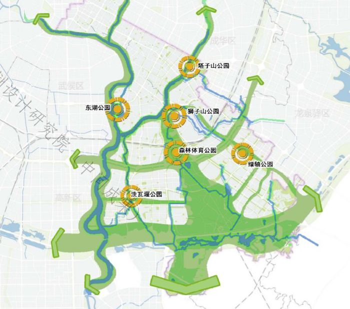 重塑生态结构,实现城绿共生的自然空间格局。将环城生态绿楔作为城市绿心,延伸至沙河,打造“锦江-沙河-环城生态绿楔”生态骨架。规划小游园、微绿地百余处,为城市增花添彩。并打造东湖公园、狮子山公园等6个大型城市公园。