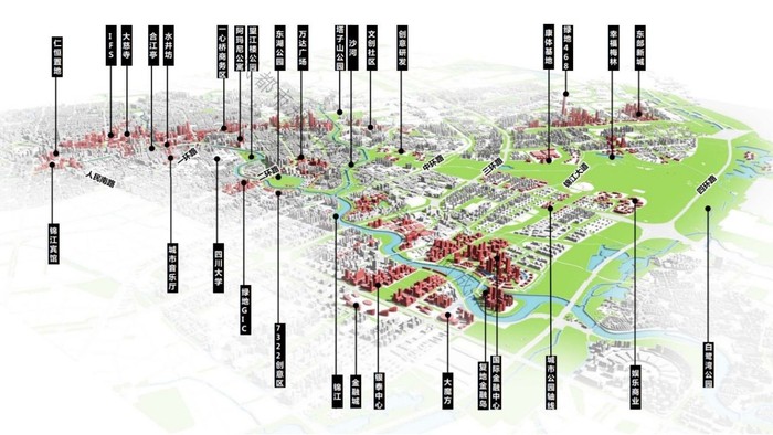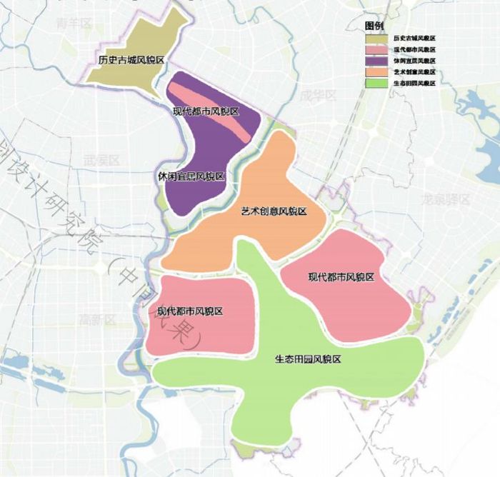 在锦江区内构建五大主题分区,包括历史古城风貌区、现代都市风貌区、休闲宜居风貌区、艺术创意风貌区和生态田园风貌区。