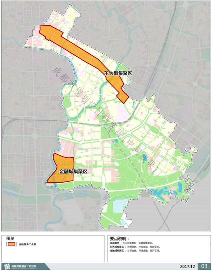 两区指东大街集聚区、金融城集聚区。东大街集聚区重点发展消费金融、外资金融、金融安全;金融城集聚区重点发展总部金融、传统金融、资产管理。