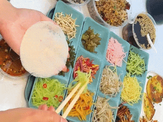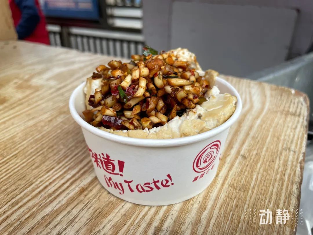 丝娃娃摊主将折耳根、酸萝卜、脆哨丁等十几种多巴胺小菜整齐排列,面皮一包,汤汁一灌,美味就此诞生。