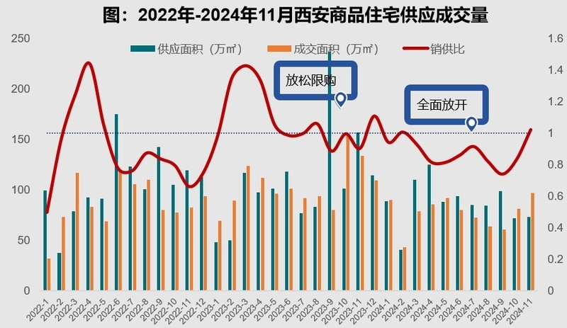 从成交量来看,据中指研究院发布的数据显示,今年前11个月,西安商品住宅新增供应面积961.7万平方米,比去年同期下滑19.11%,成交面积846.52万平方米,同比下滑26.26%。其中,10月份、11月份商品住宅成交量环比连续上涨33.9%、19.59%。