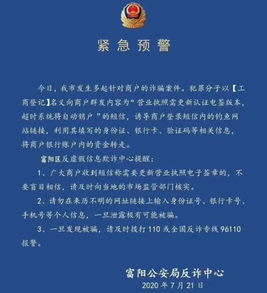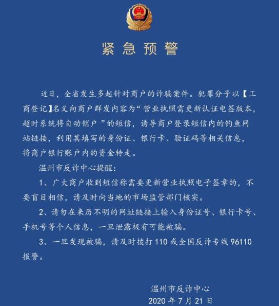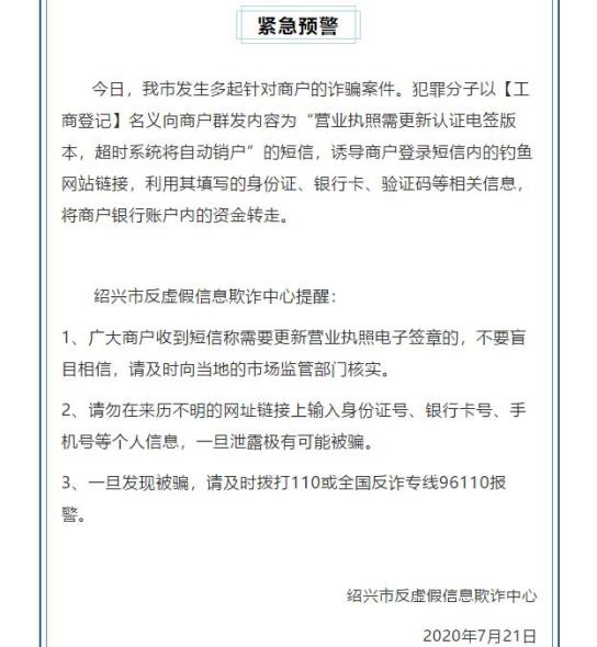 警方提醒:电子营业执照目前可在支付宝和微信小程序“电子营业执照”进行申领。请不要轻信来历不明的电话和手机短信,不点击陌生链接,不要透露自己及家人的身份证号、账号及密码等个人信息,谨防上当受骗。