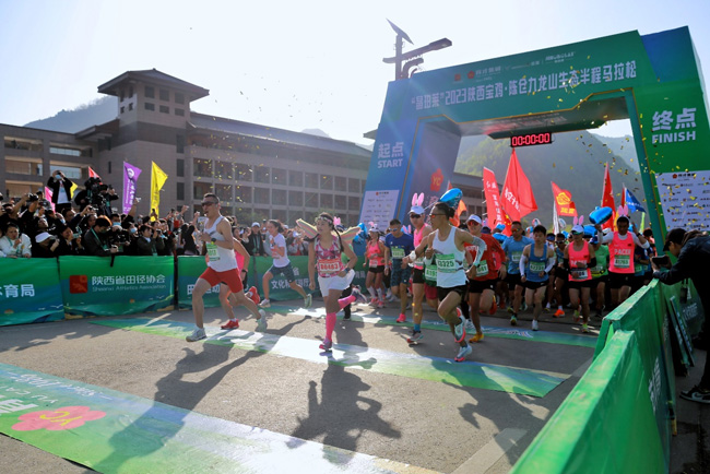 4月16日,2023陕西宝鸡·陈仓九龙山生态半程马拉松在九龙山景区鸣枪起跑,来自全国各地的8000多名专业运动员和跑步爱好者参加比赛。
