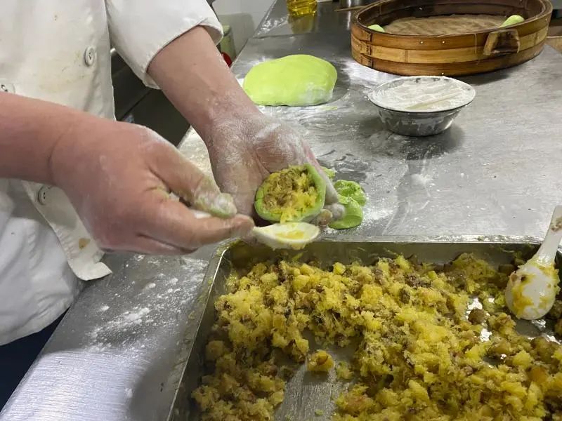 今年,杏花楼推出的新品是“荠菜鲜肉”,虽然其余老字号早有尝试,但比较下来,杏花楼的更有底气。咬开它你会发现,里面混合的居然是肉丁,而不是肉糜。据师傅透露,肉丁选用的是肥瘦均匀的五花肉,而爽脆的藕丁则增加了青团略带微甜的口感。此外,馅料里还用了火腿末“吊鲜”,鲜甜相配,相得益彰。