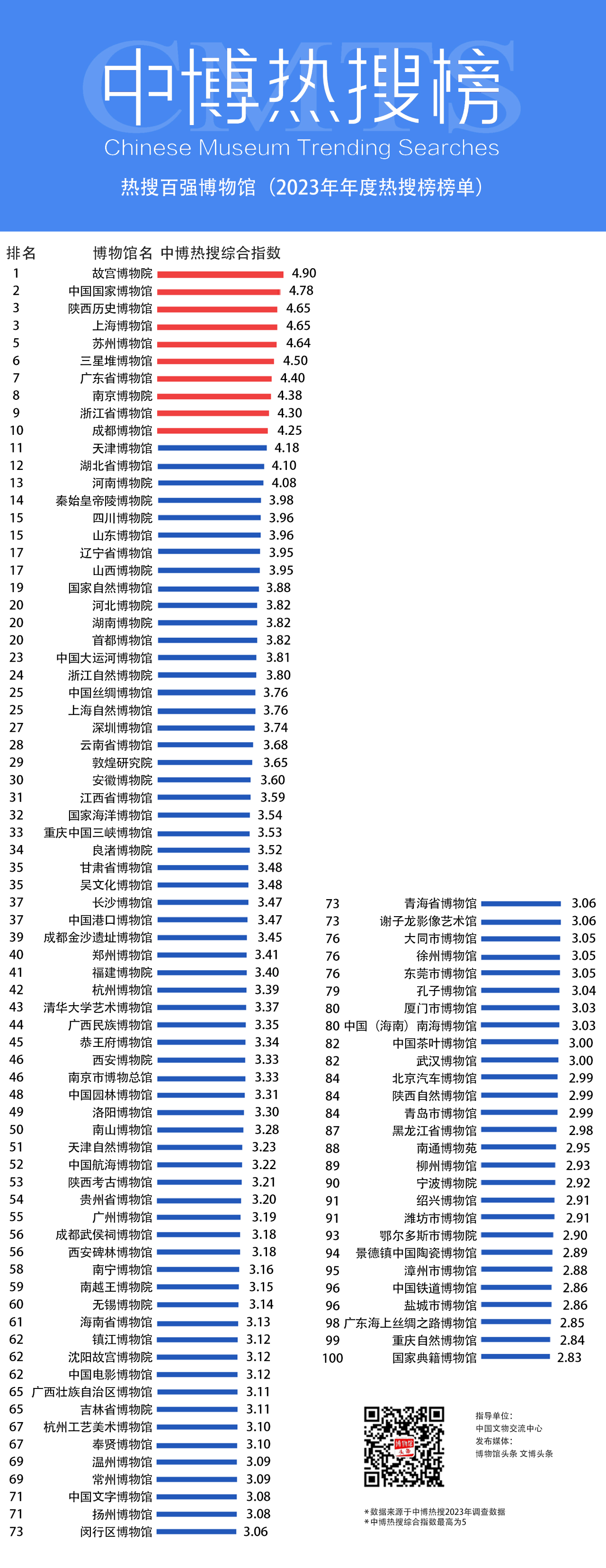 本次共有100家受到网友高频搜索的博物馆上榜。年终榜单根据全年四季度各馆“中博热搜指数”平均值排名,自动生成百强榜单。全年共有133家博物馆被中博热搜榜各季度榜单收录,其中30余家博物馆未进入年度总榜。