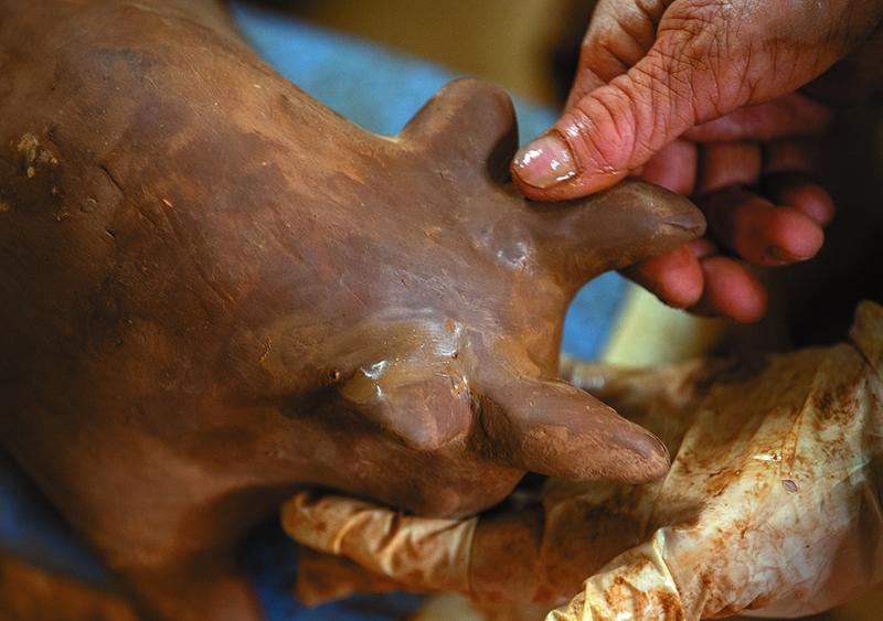 工作人员对泥塑进行抛光处理。一件泥塑需要经历13道工序才能制作完成。 照片均由记者 赵晨摄