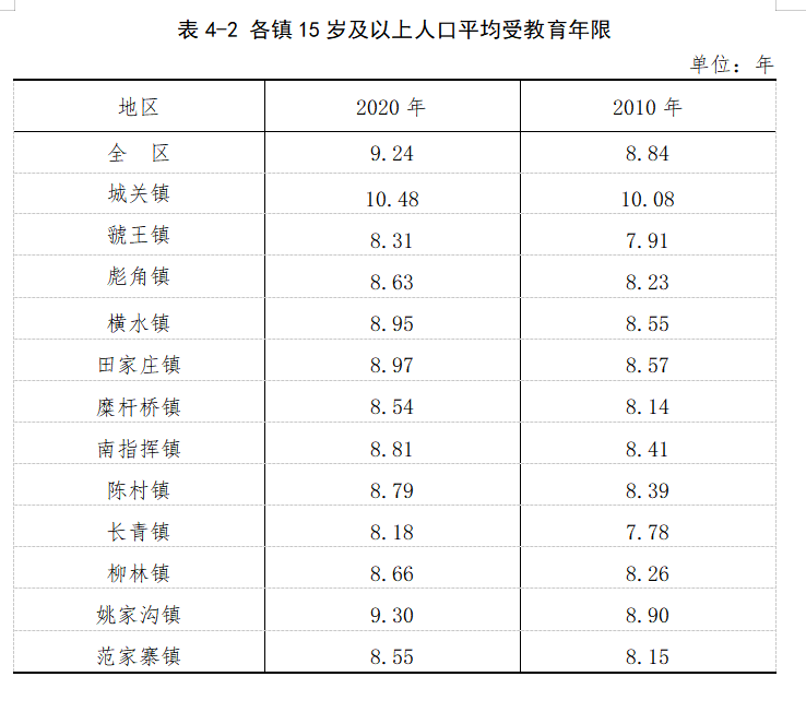 与2010年第六次全国人口普查相比,全区人口中,15岁及以上人口的平均受教育年限由8.84年上升至9.24年。