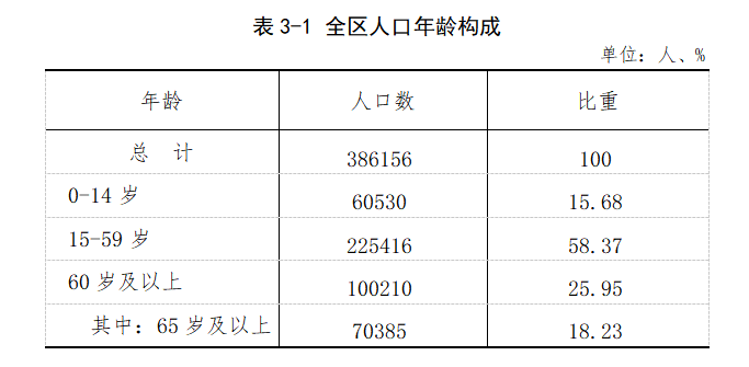 全区常住人口中,0-14岁人口为60530人,占15.68%;15-59岁人口为225416人,占58.37%;60岁及以上人口为100210人,占25.95%,其中65岁及以上人口为70385人,占18.23%。与2010年第六次全区人口普查相比,0-14岁人口的比重上升0.97个百分点,15-59岁人口的比重下降12.82个百分点,60岁及以上人口的比重上升11.84个百分点,65岁及以上人口的比重上升9.28个百分点。