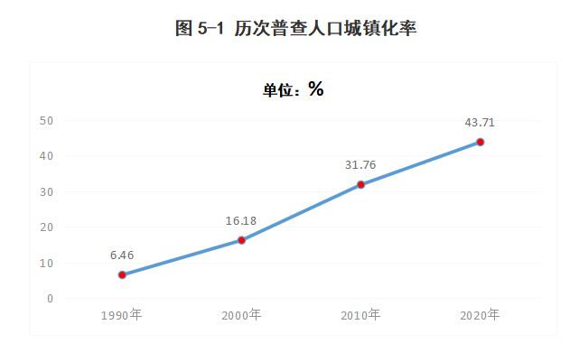 全区常住人口中,居住在城镇的人口为168795人,占常住人口的43.71%;居住在乡村的人口为217361人,占常住人口的56.29%。与2010年第六次全国人口普查相比,城镇人口增加15235人,乡村人口减少112550人,城镇人口比重提高11.95个百分点。