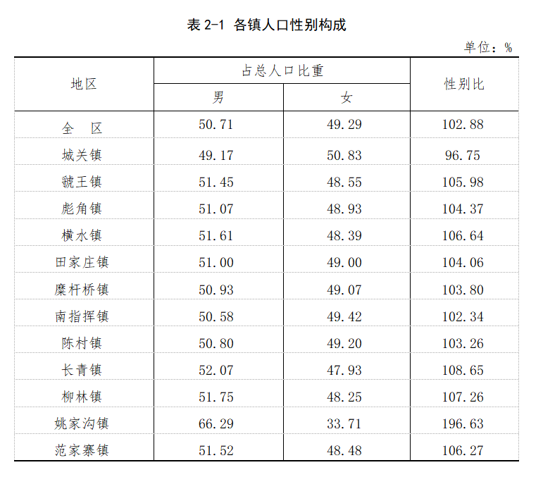 12个镇中,总人口性别比在100以下的镇有1个,在100至105之间的镇有5个,在105至110之间的乡镇有5个,在110以上的镇有1个。