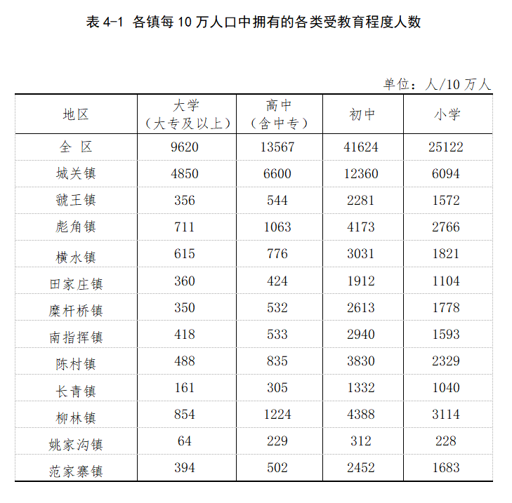 与2010年第六次全国人口普查相比,每10万人中拥有大学文化程度的由5662人上升为9620人;拥有高中文化程度的由12718人上升为13567人;拥有初中文化程度的由45699人下降为41624人;拥有小学文化程度的由26240人下降为25122人。
