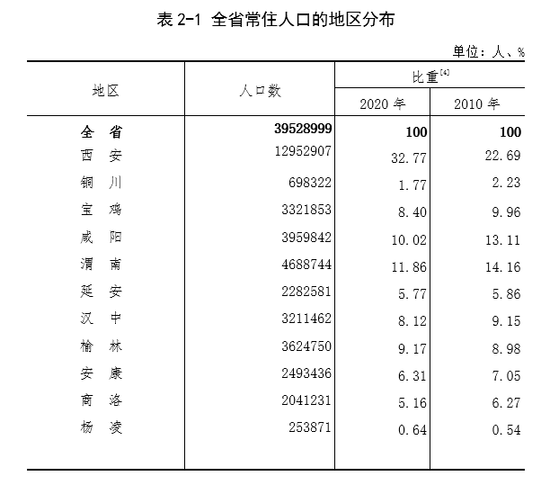 分区域看,与2010年第六次全国人口普查相比,关中地区人口所占比重增加2.77个百分点,陕北地区人口所占比重增加0.11个百分点,陕南地区人口所占比重减少2.88个百分点。