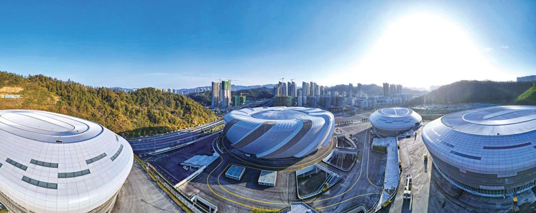 奥体中心分为综合体育馆、综合训练馆、青少年活动馆、游泳跳水馆四大场馆,在蓝天的映衬下,外观大气、造型新颖,是一处极具现代化的城市地标。尤其是综合体育馆,从空中俯瞰像一朵盛开的石榴花,也像一个滚滚向前的车轮,寓意着“石榴花开,车轮滚滚”。