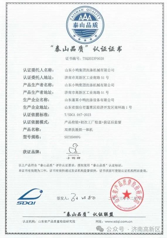 2024年1月2日,山东省市场监督管理局印发《关于发布2023年度“泰山品质”认证企业产品名单的公告》,山东小鸭集团洗涤机械有限公司的“小鸭”牌双扉洗脱烘一体机位列其中,这是继山东鲁软数字科技有限公司的“鲁软”牌电动汽车直流充电机获2021年度“泰山品质”认证后,济南高新区又一家企业获此殊荣。