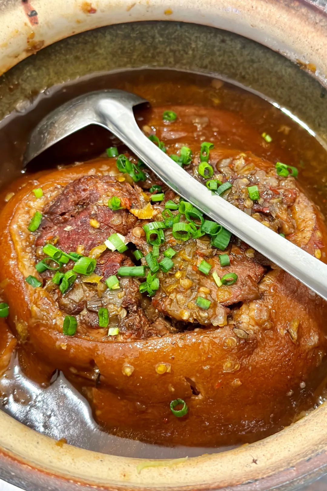 再比如这一道祖庵冰糖肘子,在色香味上都有着极致要求。汤汁浓郁、晶莹剔透、光可照人,入口品尝,肘子肥而不腻、瘦而不柴,回味悠长。类似的代表菜还有祖庵叉烧鳜鱼、祖庵冰糖肘子、祖庵赛熊掌、祖庵桂花蹄筋、祖庵羊掌煲……