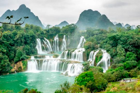 德天瀑布横跨中国和越南,每年的6月-11月是瀑布的丰水期,景色也是最美的。这里奇山异水,风景秀美,登上观景台,看瀑布倾泻而下,就像一道水帘挂在悬崖上,近观十分震撼,感叹大自然的神奇。
