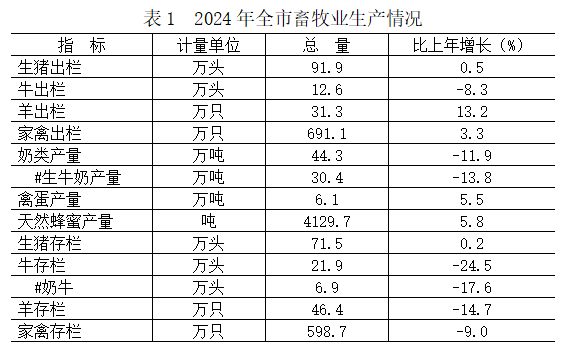 全年畜牧业生产形势稳定,主要畜牧产品产量、畜禽出栏总体增势平稳。