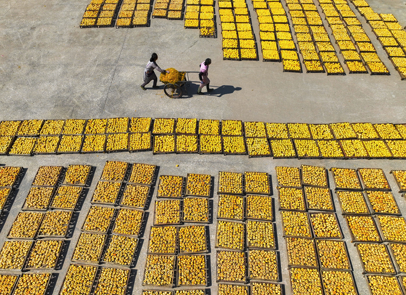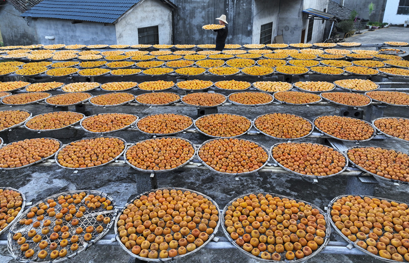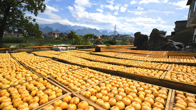 金秋时节,广西桂林市恭城瑶族自治县的月柿迎来收获季。当地柿农趁着晴好天气加紧采摘加工,房前屋后遍地金黄,瑶乡处处一派丰收景象。