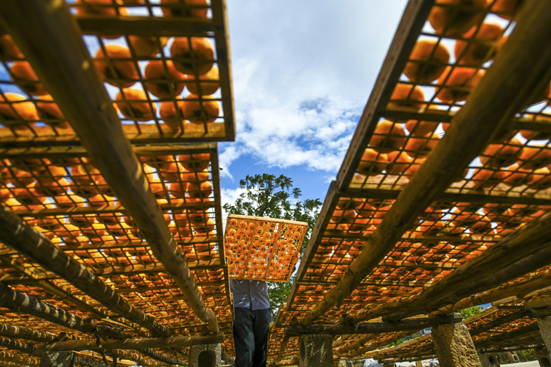 10月26日,在广西桂林市恭城瑶族自治县嘉会镇秧家村,柿农在晾晒柿子。