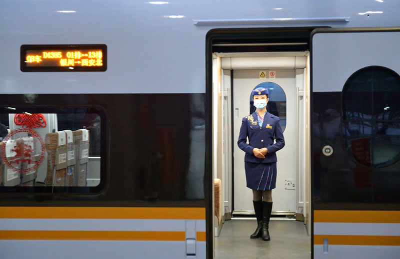 12月26日,乘务员在银川站等待银川开往西安北的D4385次列车的乘客乘车。