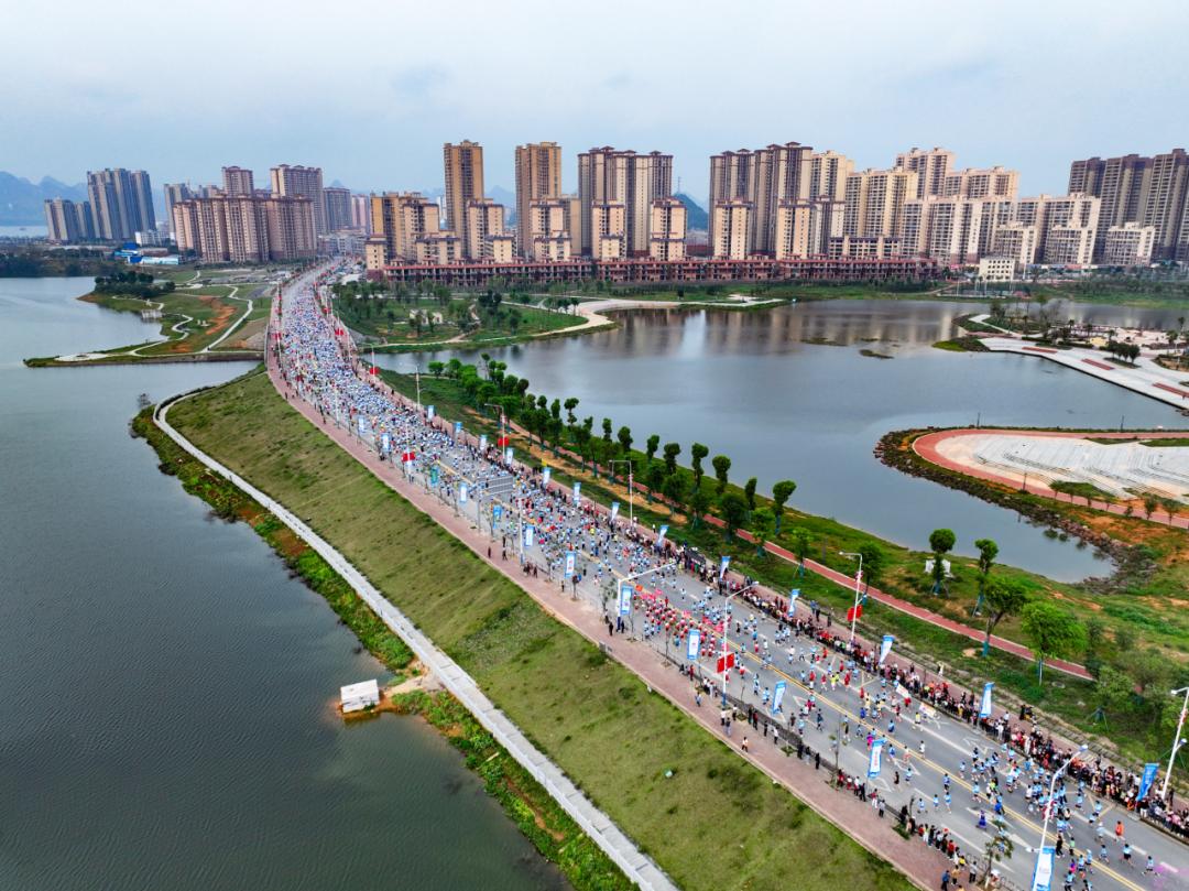 赛事起、终点都位于武宣县市民广场,赛道两旁,开阔的城市江景一览无余,让人心旷神怡,凝聚起踏上比赛征程的勇气。