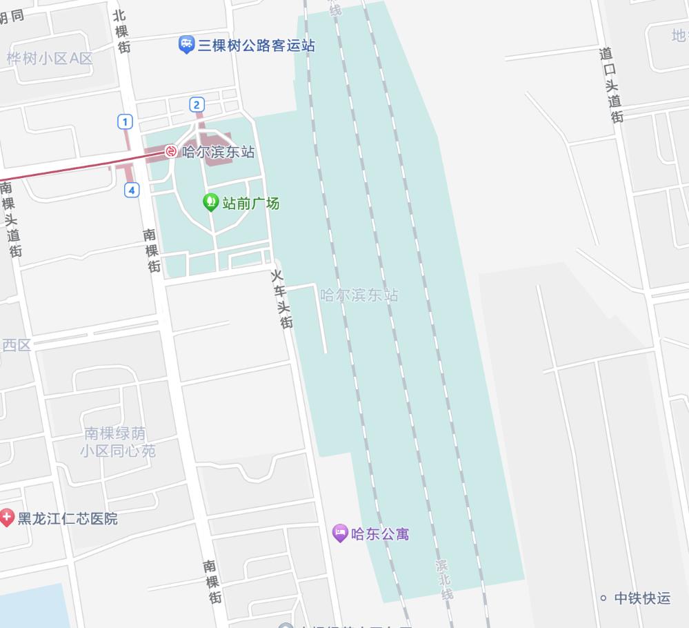哈尔滨东站位于哈尔滨市道外区桦树街1号,是一座铁路枢纽客货综合性车站,于2016年10月30日完成站改工程。全站线路27条,其中3座站台,14条调车线,13条到发线。