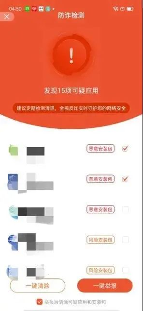 (点击此按钮快速举报可疑应用/安装包,可勾选举报后清除即可在举报后删除可疑应用/安装包)