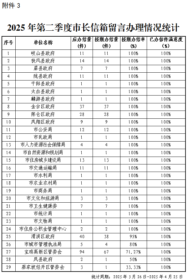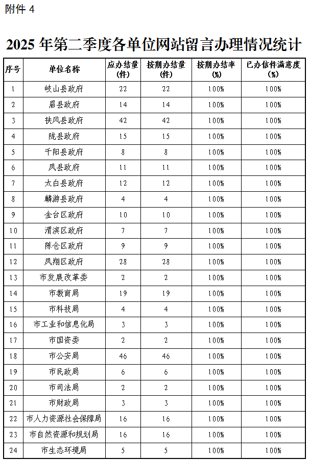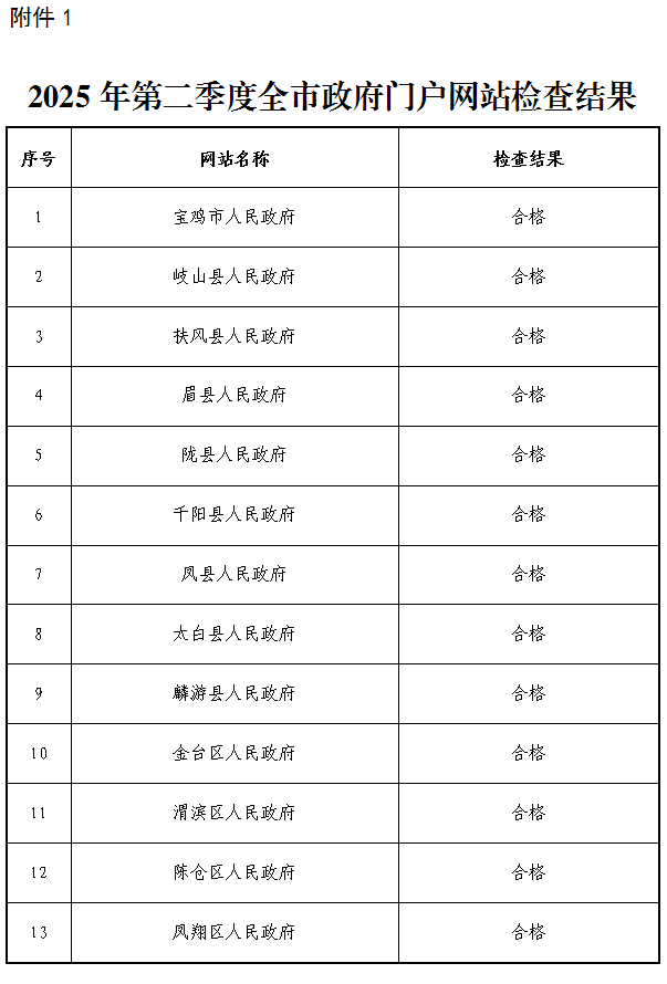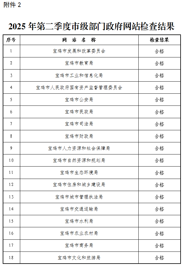 按照《陕西省政府网站与政务新媒体管理细则》(陕政公开办〔2021〕18号)、《宝鸡市政府网站管理办法(修订)》(宝政办发〔2021〕23号)要求,市数据局委托第三方机构,组织开展了2025年第二季度全市政府网站监测检查,现将有关情况通报如下。
