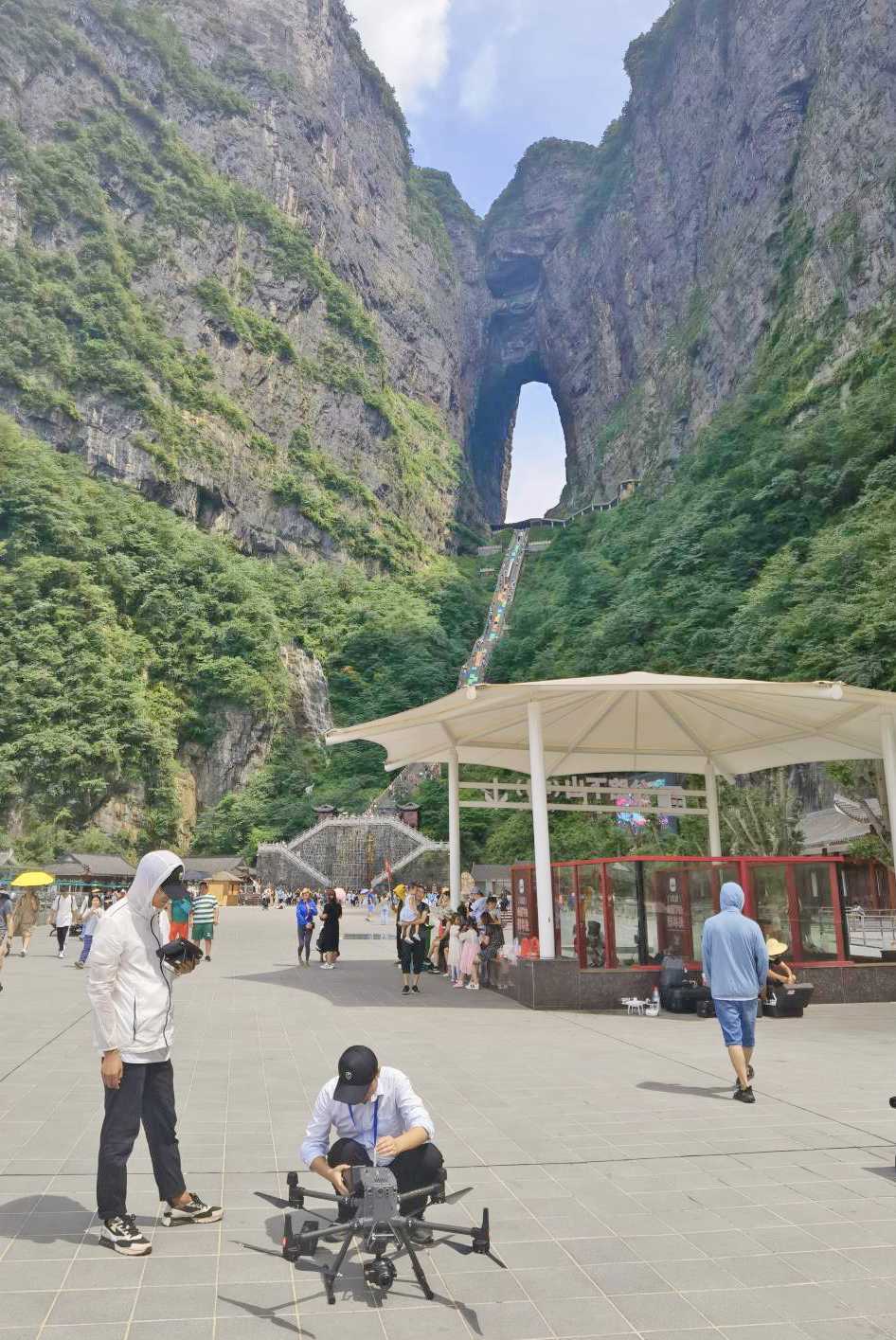 实景三维张家界项目组成员使用无人机贴近航拍天门洞。宾俊敏摄