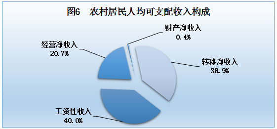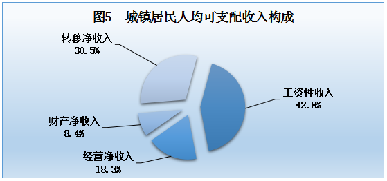 据城乡一体化住户调查,全年全市居民人均可支配收入17346元,比上年增加1512元,增长9.5%。其中:工资性收入7248元,增长9.4%,占可支配收入的比重为41.8%;经营净收入3325元,增长9.1%,占19.2%;财产净收入968元,增长9.7%,占5.6%;转移净收入5806元,增长10.0%,占33.4%。