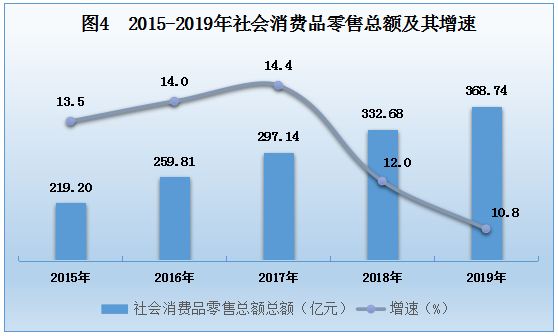 全年社会消费品零售总额368.74亿元,比上年增长10.8%。其中:限额以上企业(单位)实现零售额247.98亿元,增长14.4%。