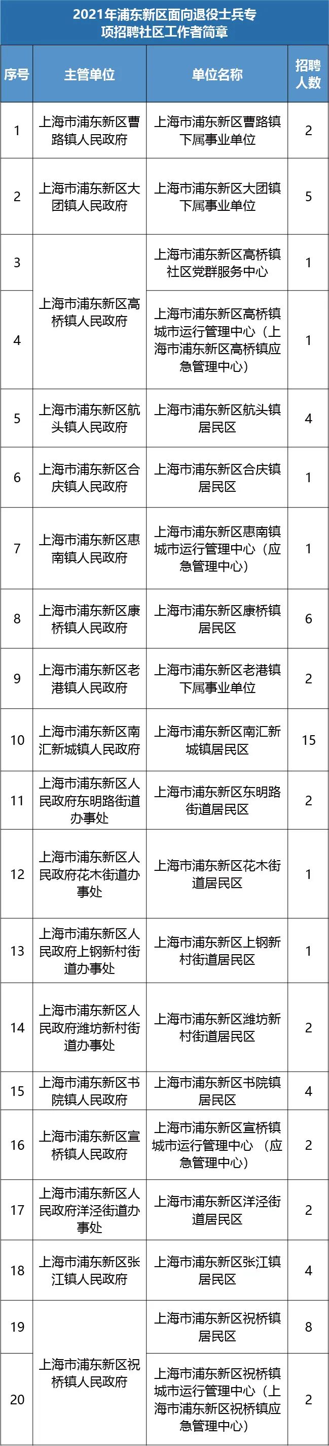 5.具备招聘岗位所要求的户籍、年龄等具体条件。具体岗位要求以《2021年浦东新区面向退役士兵专项招聘社区工作者简章》为准。