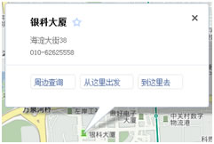 信息窗提供“周边查询”、“公交查询”、“驾车查询”和“收藏”的功能,还提供位置信息的详情。