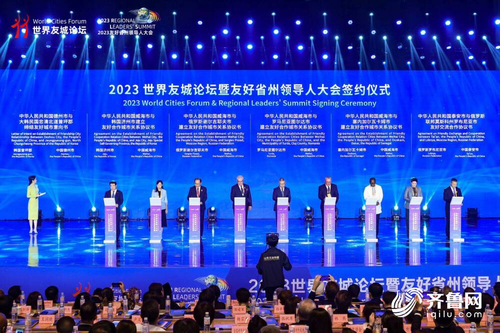 (图 / 在2023世界友城论坛暨友好省州领导人大会开幕式上,威海与罗马尼亚图尔达市、韩国济州市、塞内加尔瓦卡姆市、俄罗斯谢尔吉耶夫市4个国际友好城市现场签约,正式缔结友好合作城市关系)