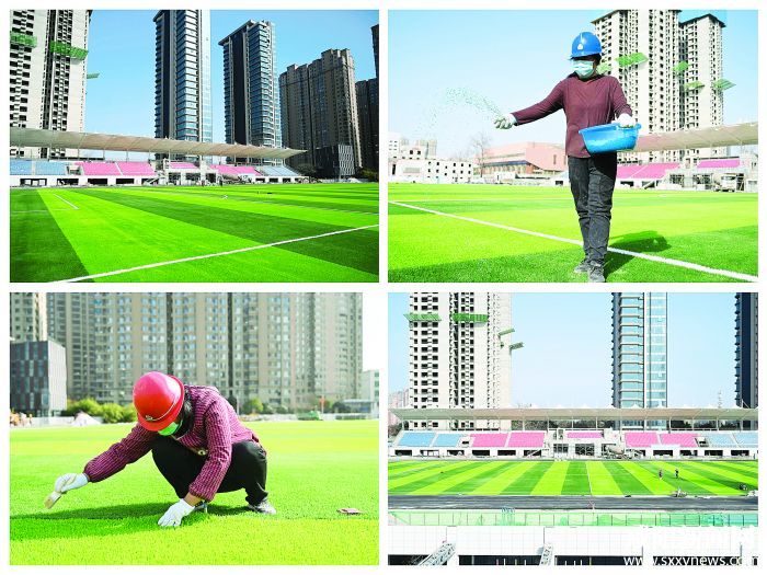 图为3月7日,体育场全貌以及工人正在给足球场撒防滑颗粒和最后的修整。