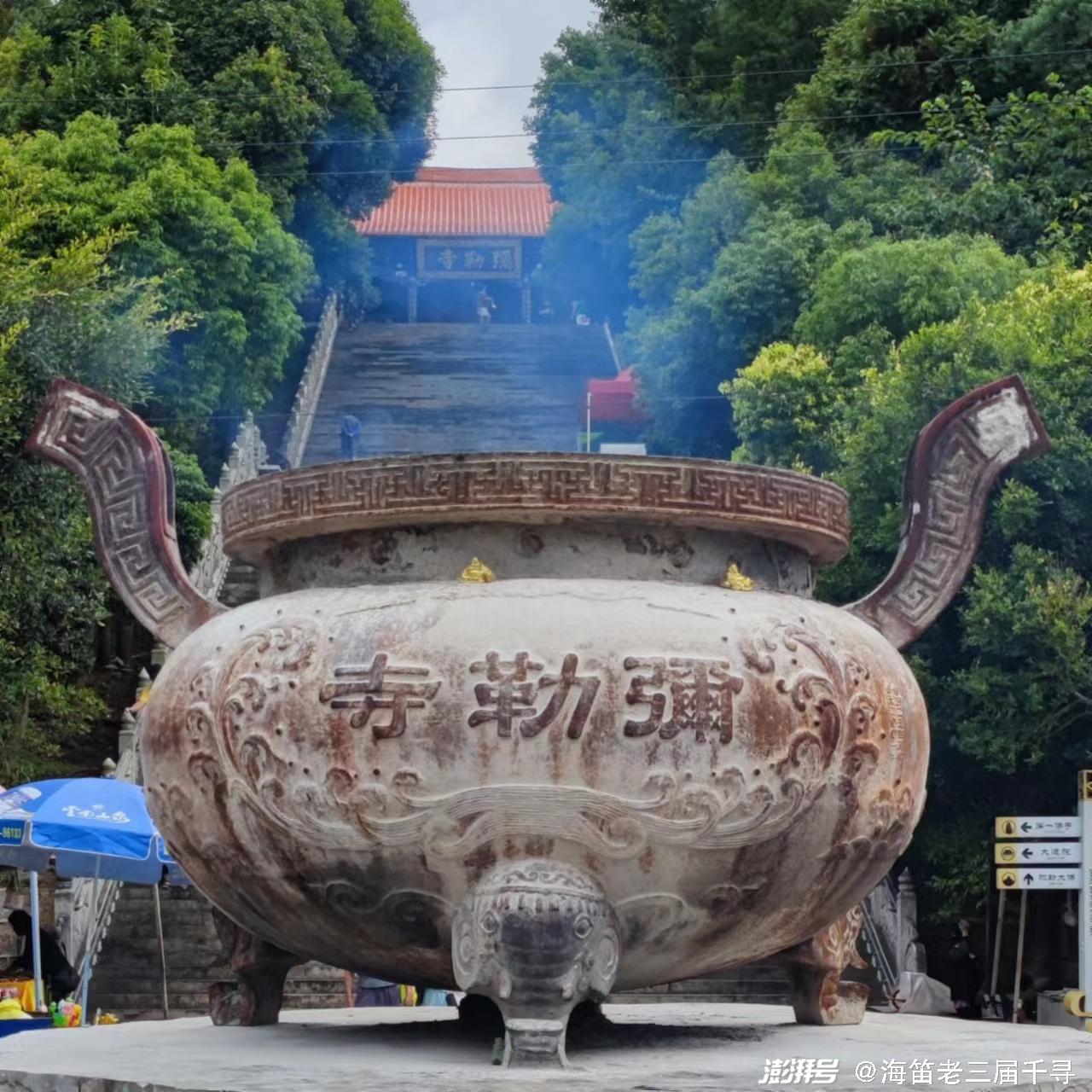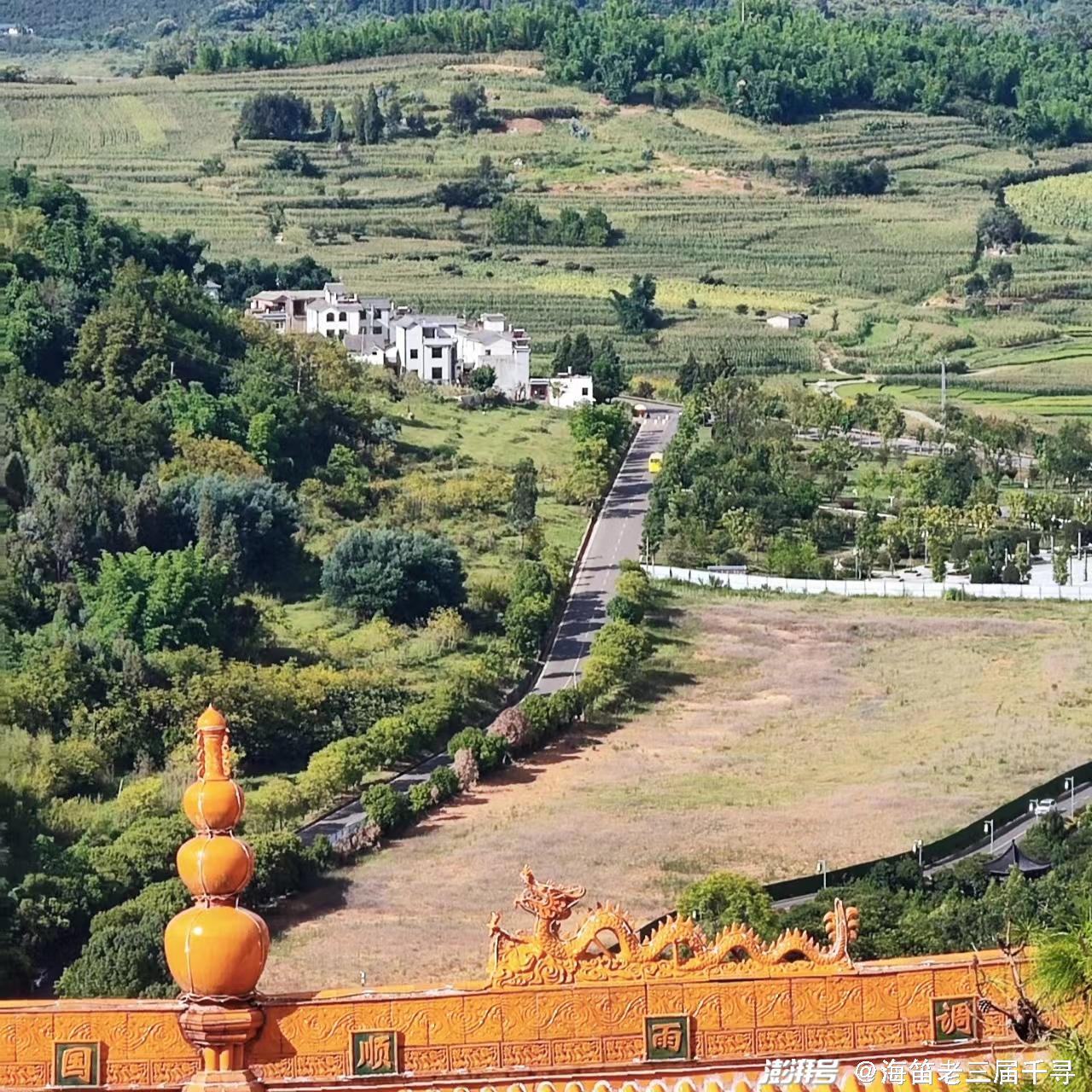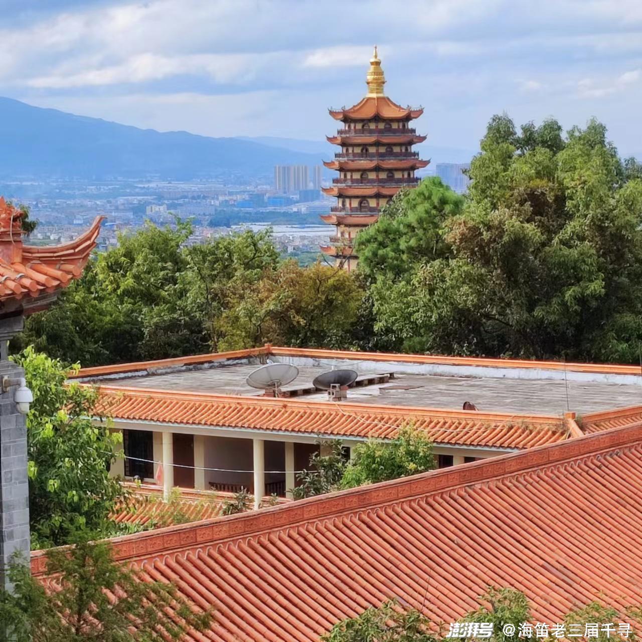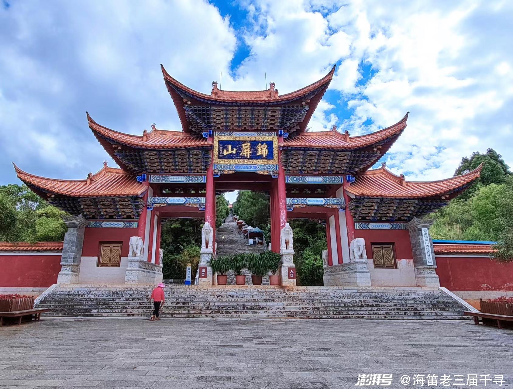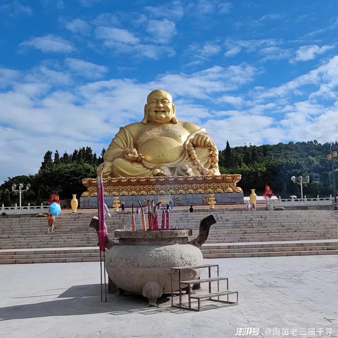 弥勒市的弥勒大佛很有名,在该市的锦屏山景区,距弥勒市区10公里,那天我到了这里。锦屏山弥勒寺山门上方,悬挂着中国佛教协会会长赵朴初亲笔题写的“弥勒寺”寺名。进入景区,但见绿荫叠翠,清泉潺潺,花香鸟语。山间红墙黄瓦,庙宇恢宏,一步一景。 拾阶而上一千九百九十九级台阶,我们见到了位于锦屏山怀抱的弥勒大佛。这尊弥勒大佛佛身全部用进口钛金铸就,金光灿烂。于1999 年落成,佛身高度1999厘米,是世界上最大的弥勒坐佛像。弥勒佛基座高4.96 米,镶满洁白的莲花瓣和如意宝珠,象征弥勒佛城美好净土,纯洁富饶,人们安乐如意。基座上的"弥勒大佛”四字为台湾佛学家南怀瑾居士所题,站在山顶,远远地望去,弥勒大佛神态端庄,笑容满面,目光深远,发出会心的微笑,能感受到这尊金光灿灿的大佛佛性的光辉。从这里眺望远处,千山万壑尽收眼底,蓝天白云,恍如人间仙境。弥勒佛“大肚能容,容天下难容之事;笑口常开,笑世间可笑之人”仍启迪着我们的心灵。