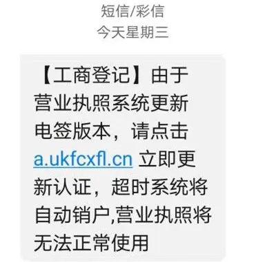 近日,个体户周某收到一条标记【工商登记】短信,称“营业执照需要更新认证电签版本,超时系统将自动销户”,短信中附带操作链接。
