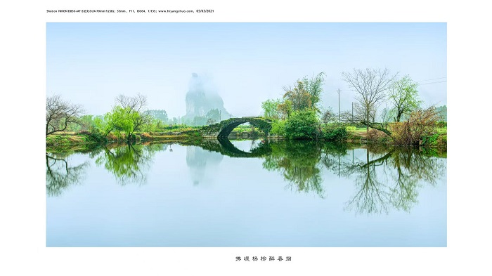 桂林山水除了形态、环境等表现的美感外,有一个最具东方表征意义的美--朦胧美。细雨中的桂林山水时隐时现,当地摄影师就把这些自然风光用镜头记录下来,再打印出来裱上木框,成为赏心悦目的山水画,挂家里或送亲人都特有美感。如这幅《拂堤杨柳醉春烟》(45cm*90cm),记录的是早春三月,小草长出了嫩绿的芽儿,原野上的杨柳,枝条柔软而细长,轻轻地拂扫着堤岸。细雨中,烟雾缭绕,古桥山峰若隐若现,好一幅生机勃勃的春景图。