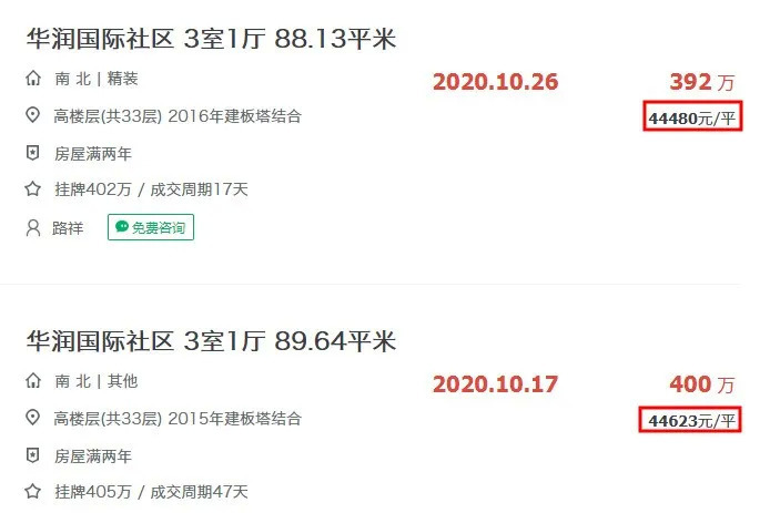 如今仅有华润国际社区在售,根据链家的挂牌数据显示,目前华润国际社区仅有28套房源在售,挂牌均价41360元/㎡,最高成交价格达到44623元/㎡。