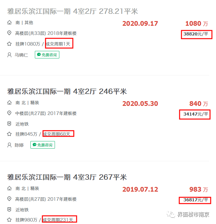 从雅居乐一期最近的成交记录来看,成交面积都非常大,动辄两百多平起步,成交价在2.9万/㎡-3.8万/㎡之间浮动,成交周期从1天到231天不等。