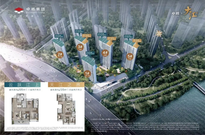 卓越大江预计12月加推,具体楼栋待定,项目剩余1、2、4号楼,约344套房源,精装交付,户型建筑面积105、135㎡。