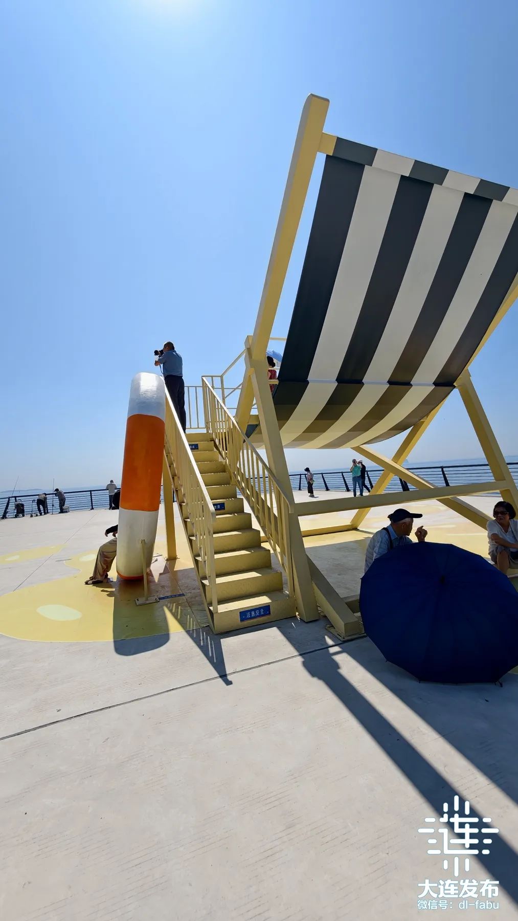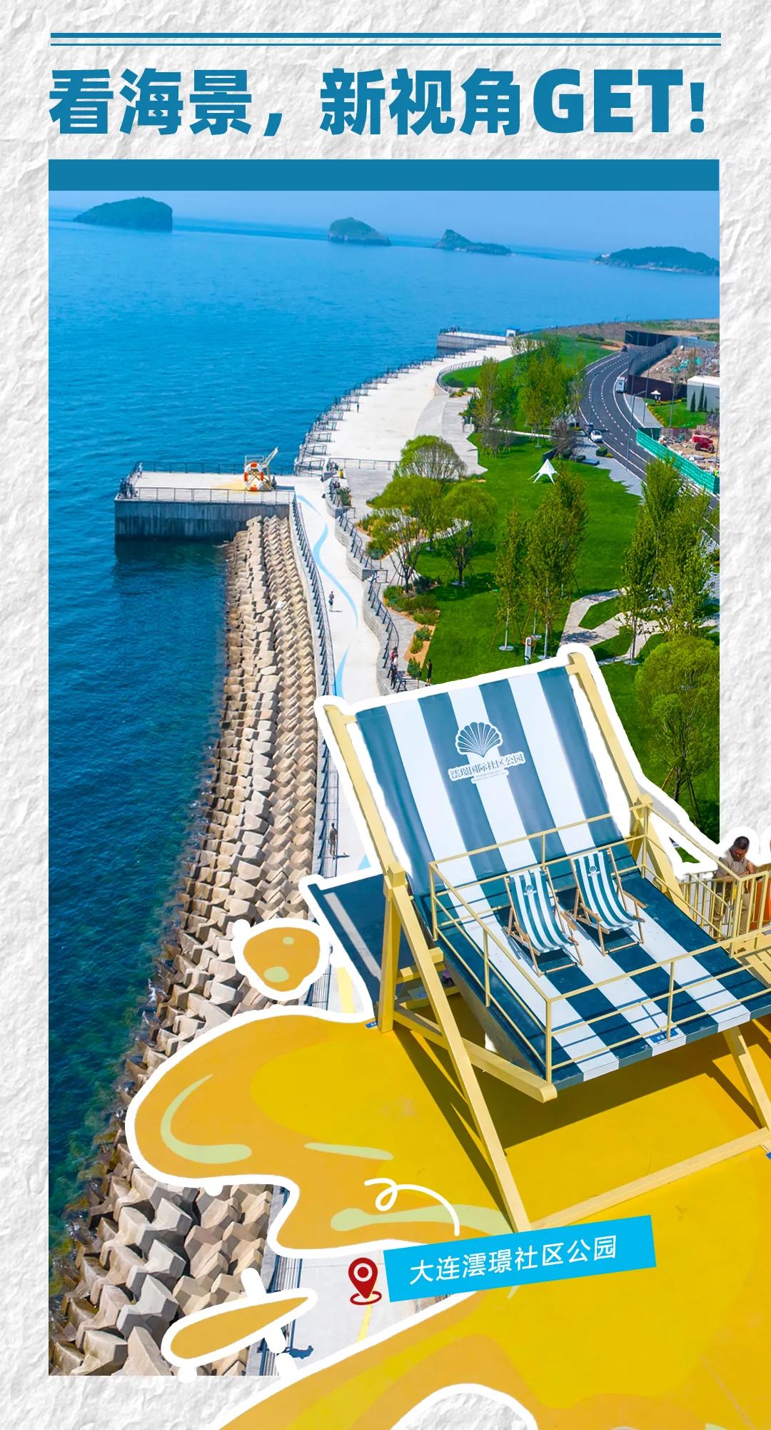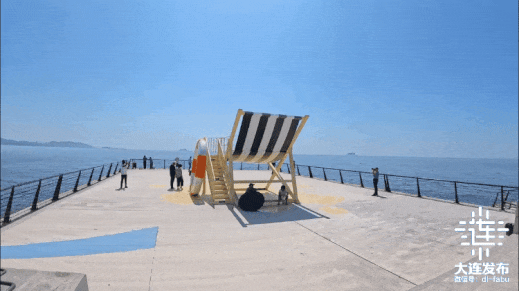 在亲海观景平台上,一座巨型蓝白相间的沙滩座椅会突然闯入视野,身旁斜倚着同样巨大的游泳圈,像是童话里巨人遗落人间的夏日玩具。