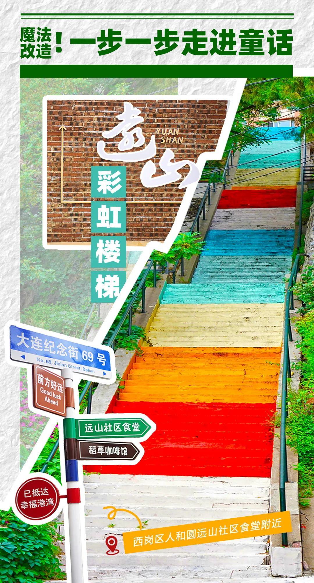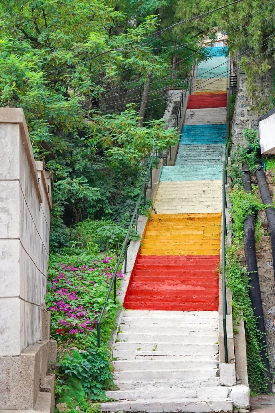 纪念街69号的楼梯被“魔法改造”,变身成通往童话世界的神奇通道,五彩缤纷的彩虹楼梯和夏天有着超高的适配度,也为这里的老居民楼群增添了一抹生趣。